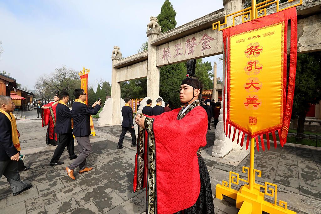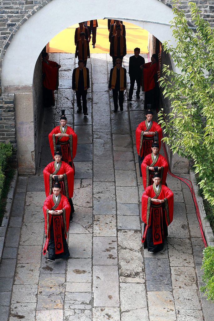 9月28日,山东济宁,癸卯年公祭孔子大典在曲阜举行。各界参祭人员在司礼官的引领下,缓步行至孔庙大成殿前。 中新社记者 梁犇 摄