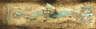 巩文:二里头遗址是1959年著名考古学家徐旭生先生率队在河南西部进行考古调查时发现的,自此拉开了夏文化探索的序幕。二里头遗址距今3800年,是一座面积超过300万平方米的超大型都邑。这件绿松石龙形器放置于墓主人身上,由2000余片绿松石组合而成。龙身长64.5厘米,中部最宽处4厘米,巨头蜷尾。龙身有铜铃,内有玉石铃舌,龙身曲伏有致,形象生动传神。