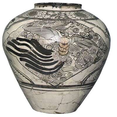 出土于北京元大都遗址的白地黑花龙凤纹瓷罐。