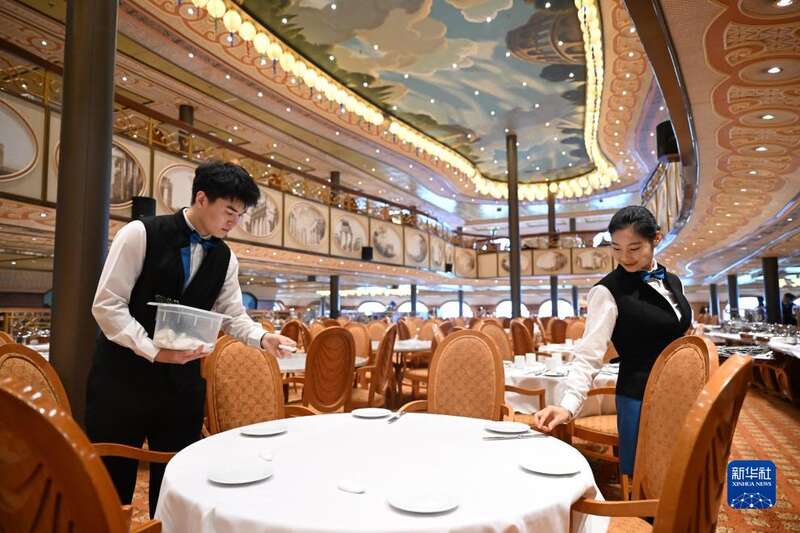 9月27日,中国船舶集团旗下爱达邮轮“地中海”号邮轮工作人员在邮轮餐厅忙碌。