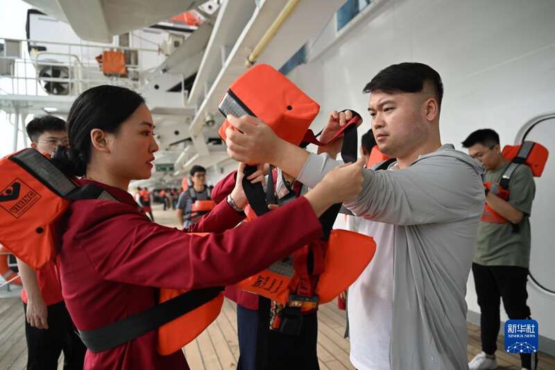 9月27日,在中国船舶集团旗下爱达邮轮“地中海”号,工作人员指导游客进行安全演习。