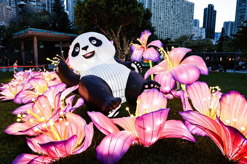 憨态可掬的熊猫形象置身花丛中。四川文投祝融彩灯文化艺术有限公司供图