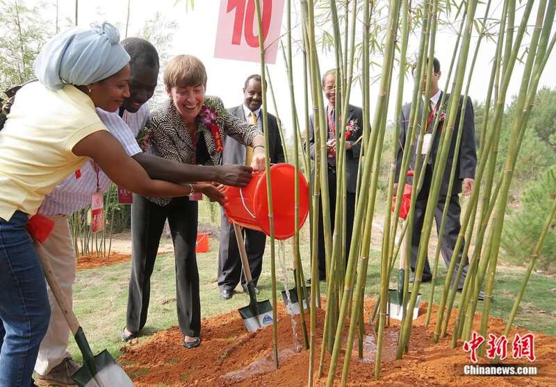 2006年10月,参加福建省武夷山第五届中国竹文化节开幕式的国际友人在武夷竹园种植纪念竹。图为时任国际竹藤组织总干事古珍(左三)等为刚种下的慈竹浇水。周文杰 摄