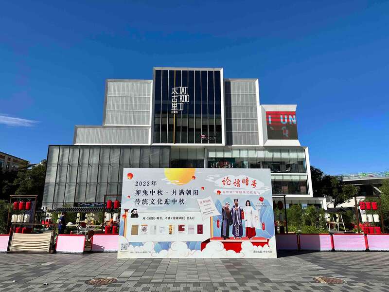 本次中秋主题文化活动分两部分。白天在太古里西区广场搭建非遗文化市集,展示了国家级非物质文化遗产代表性传承人双彦的北京兔儿爷相关文创,以及朝阳区30个非遗项目,打造出一个集非遗项目展示、文化交流、娱乐为一体的团圆市集,吸引了不少民众前来围观。晚上是由中华书局出品的国学互动节目“论语暗号”。活动期间每晚6点半、7点半、8点半,由真人扮演中华书局推出的人物“孔壮壮”(孔子的网络趣称)和两个弟子在三里屯太古里街区现身收徒,自称从春秋战国时期“穿越”而来,在舞台及街区开展国学知识问答挑战,连答三道题的观众可以获得一份盲盒礼物。