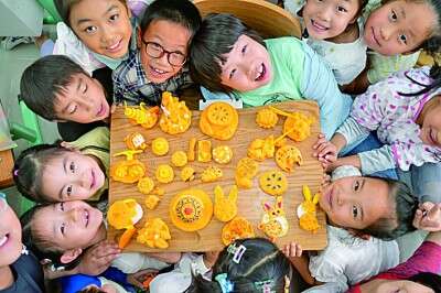 9月28日,北京第二实验小学学生展示奇思妙想的“黏土月饼”。新华社发