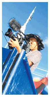 “我们还自己设计了拍摄辅助工具,把摄像机伸到接近海平面的位置拍摄。风浪大的时候,要把三脚架用绳子固定,将摄影师捆在围栏上,还需要另外两个人每人拴着一根安全绳抱住摄影师帮他保持平衡。”