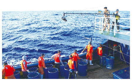 为了拍摄到金枪鱼被钓上来的水下过程,摄制组自制辅助工具,让水下摄像机紧紧贴住船底。因为渔船始终是在行进的,所以摄制组努力拍摄了无数次,一次次失败,一次次总结经验再拍,终于拍到了电影中非常精彩的水下上鱼场景。这也是整个片子的高潮部分,实属不易。
