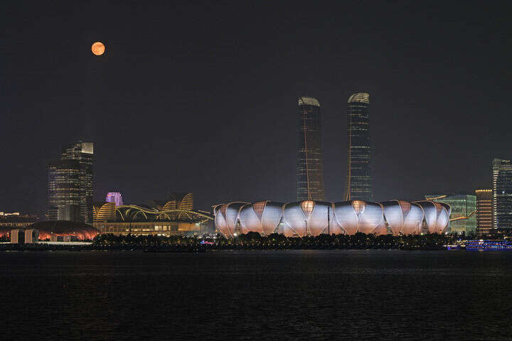 9月29日,中秋佳节。当晚,一轮“超级”满月升起在杭州奥体中心上空,光耀钱塘江两岸,吸引众多市民游客沿江观赏。新华社发(李忠 摄)