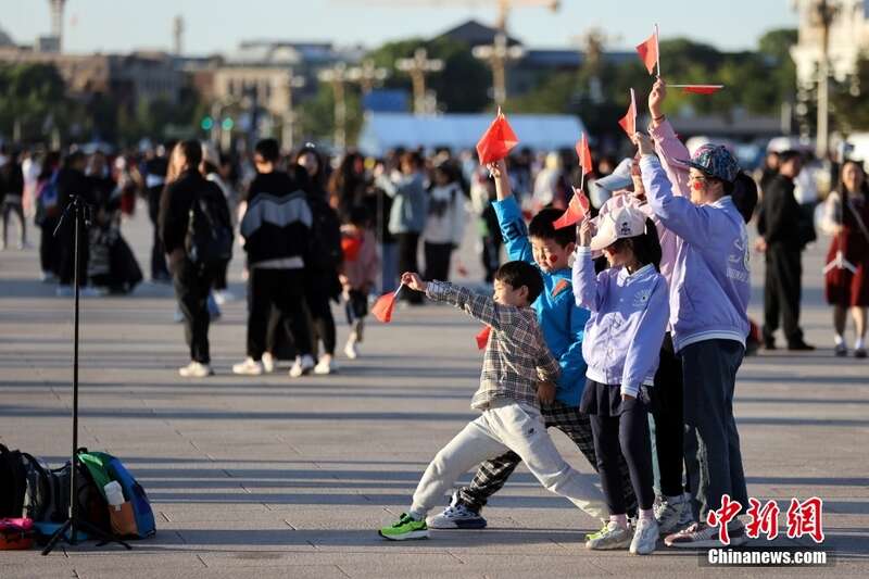 10月1日清晨,隆重的升国旗仪式在北京天安门广场举行,30.2万市民游客齐聚天安门广场,共同见证五星红旗冉冉升起的庄严时刻,庆祝新中国74周年华诞。图为小朋友手持国旗在广场拍照。