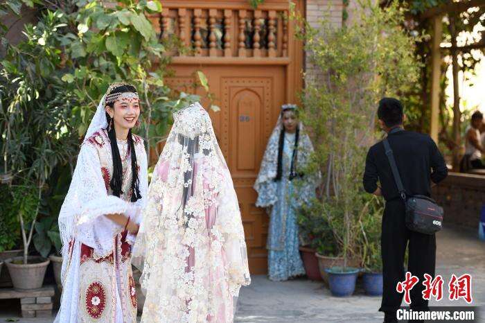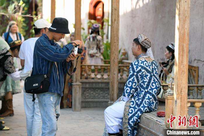 图为在喀什古城景区里一处网红打卡点旅拍摄影师正在拍摄。中新网记者 孙亭文 摄