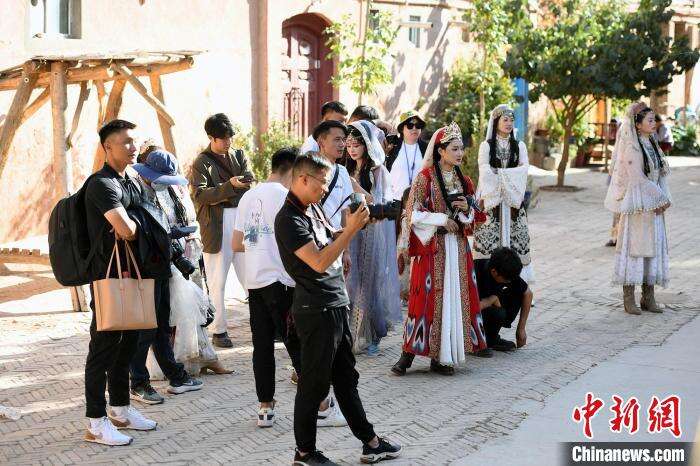 图为在喀什古城景区里一处网红打卡点,摄影师和旅拍的游客正在排队拍照。中新网记者 孙亭文 摄