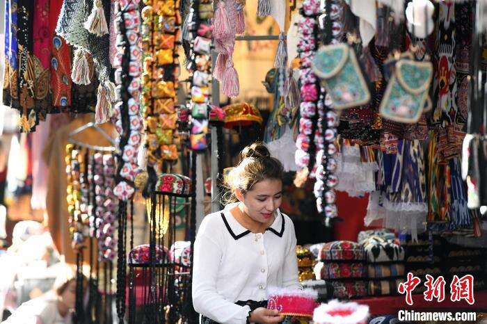 图为在喀什古城景区里一名游客正在挑选旅游纪念品。中新网记者 孙亭文 摄