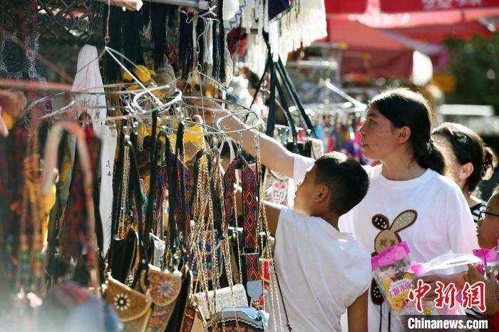 图为在喀什古城景区里两名小游客在挑选旅游纪念品。中新网记者 孙亭文 摄
