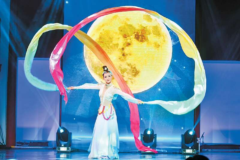 在颜料会馆舞台上,舞蹈演员挥动衣袖“月下起舞”。