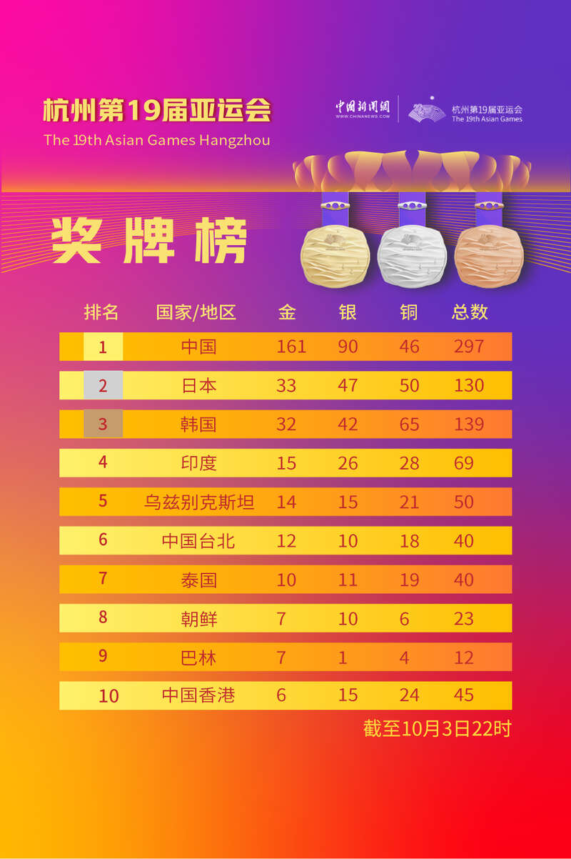 在3日的比赛中,中国体育代表团单日收获14金。奖牌榜上,中国队以161金90银46铜断层领先。第二名的争夺非常激烈,目前日本队金牌数比韩国队多1枚,但总奖牌数少9枚。