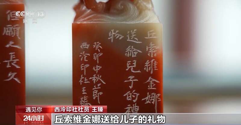 西泠印社社员 王臻:这个是刻的你儿子的名字阿廖沙,所以旁边我写了,丘索维金娜送给儿子的礼物。