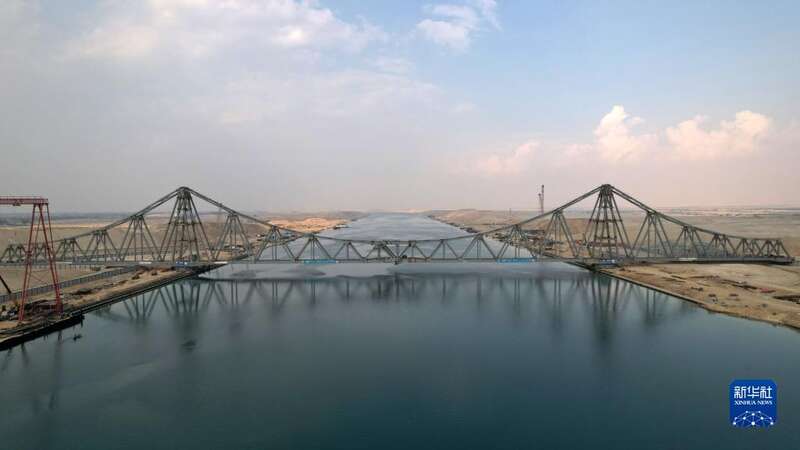这是2021年11月17日在埃及伊斯梅利亚省拍摄的苏伊士运河铁路桥旧桥改造升级项目施工现场(无人机照片)。苏伊士运河铁路桥连接非、亚大陆。
