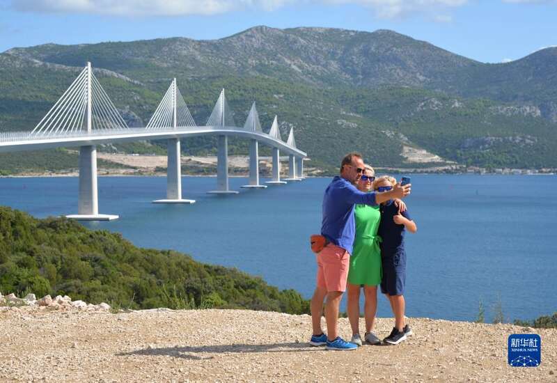 游客在克罗地亚佩列沙茨大桥前拍照留念(2023年8月29日摄)。佩列沙茨大桥横跨克罗地亚南部亚得里亚海的小斯通湾,连接该国大陆与佩列沙茨半岛,于2022年7月通车。
