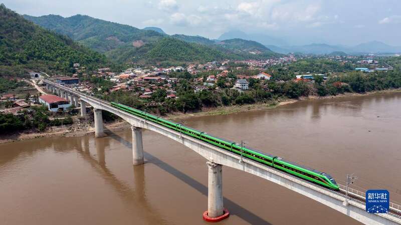 中老铁路客运列车通过老挝琅勃拉邦湄公河特大桥(2023年5月28日摄)。中老铁路琅勃拉邦湄公河特大桥全长1458.9米,由28跨T梁和6跨连续梁构成,是全线施工难度最大、技术最复杂的桥梁。