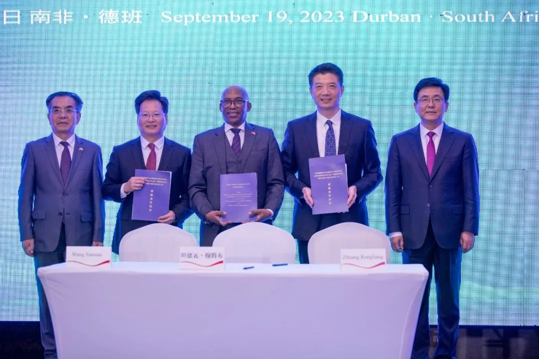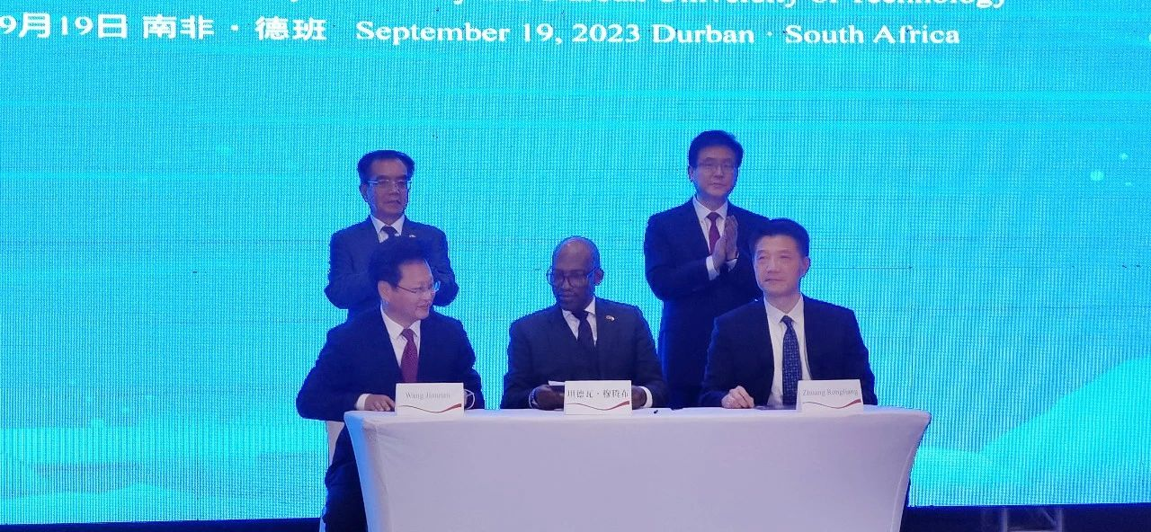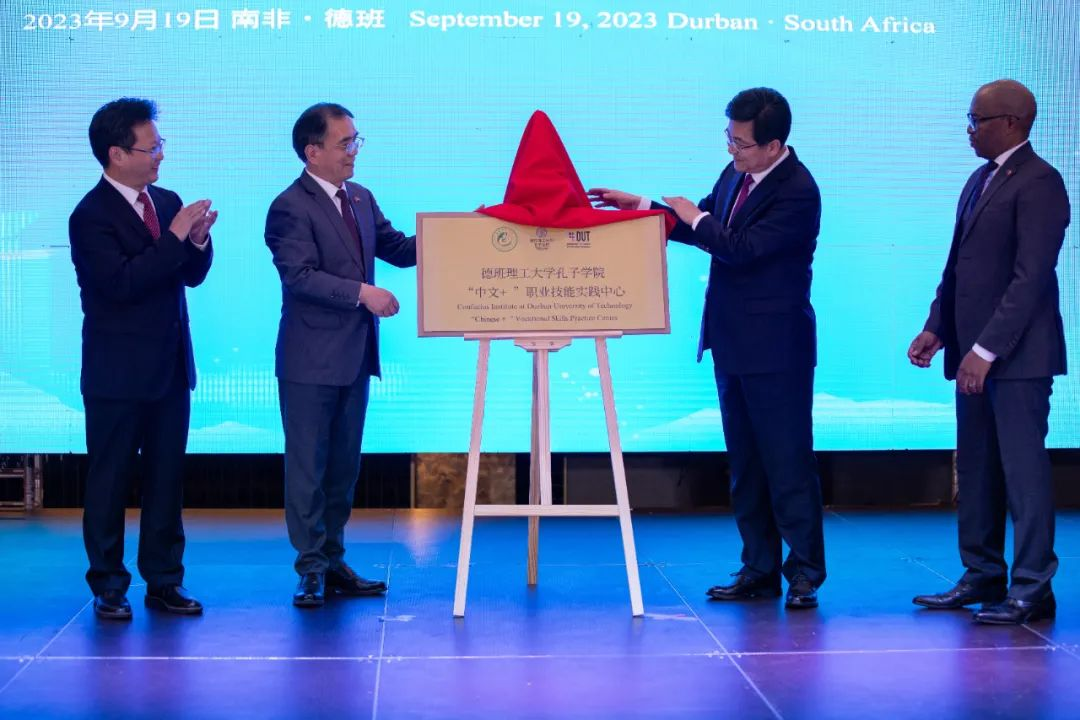 随后,赵龙省长出席了孔院建院十周年庆祝活动,观看了孔院10周年成果展以及学校大学生艺术团与孔院师生共同参演的文艺汇演,见证了学校与德班理工大学续签共建孔院协议以及学校与厦门金砖办和德班理工大学三方战略合作协议签署仪式。赵龙省长与学校党委书记王建南、德班理工大学校长姆腾布、中国驻南非德班总领事李志工共同为“德班理工大学孔子学院中文+职业技能实践中心”“中南智慧菌草平台项目”揭牌,并为全球首本中文-祖鲁语学习词典揭幕。赵龙省长还出席了学校孔院“南非中国茶文化展示中心”揭牌仪式,参观了孔院师生的茶艺表演。