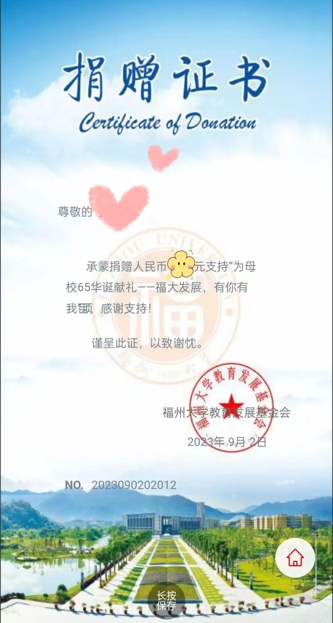 所有捐赠款项将全部用于母校的人才引进以及在校学生的奖助学金,推进学校的引才、育才工作,为福州大学65周年华诞增添光彩!为了感谢校友为母校发展所做的贡献,校友的每一笔捐赠都将生成捐赠海报,并获得由福州大学教育发展基金会颁发的实名电子捐赠证书。