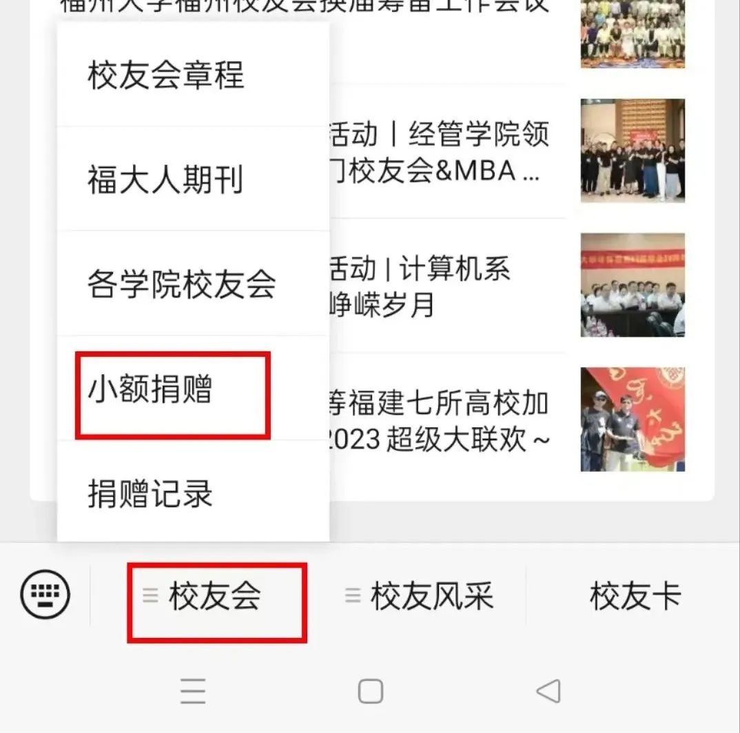 点击“校友会”——“小额捐赠”——“捐赠项目”即可进入捐赠页面,进行捐赠。