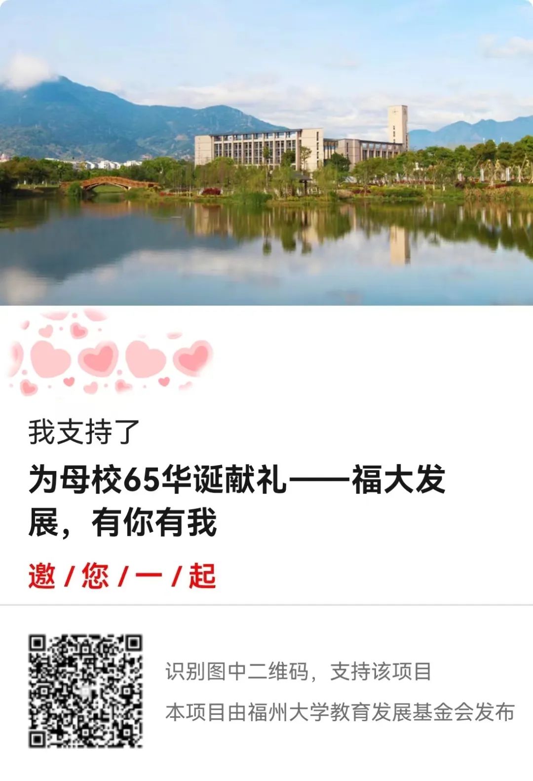 六十五载峥嵘岁月,六十五载铿锵荣光。10月28日,我们将迎来母校65周年华诞!惟实励新,精进臻善,前进的脚步永不停息,从荒芜到繁荣,从“211工程”重点建设高校到“双一流”建设高校,福州大学的快速发展离不开一代代福大人的不懈努力和艰辛付出,更汇聚了广大校友和各界朋友的殷殷关切和鼎力支持!母校已迈入新发展阶段,面临新的机遇与挑战,迫切需要广大校友同心同德、群策群力,助力母校各项事业快速发展。