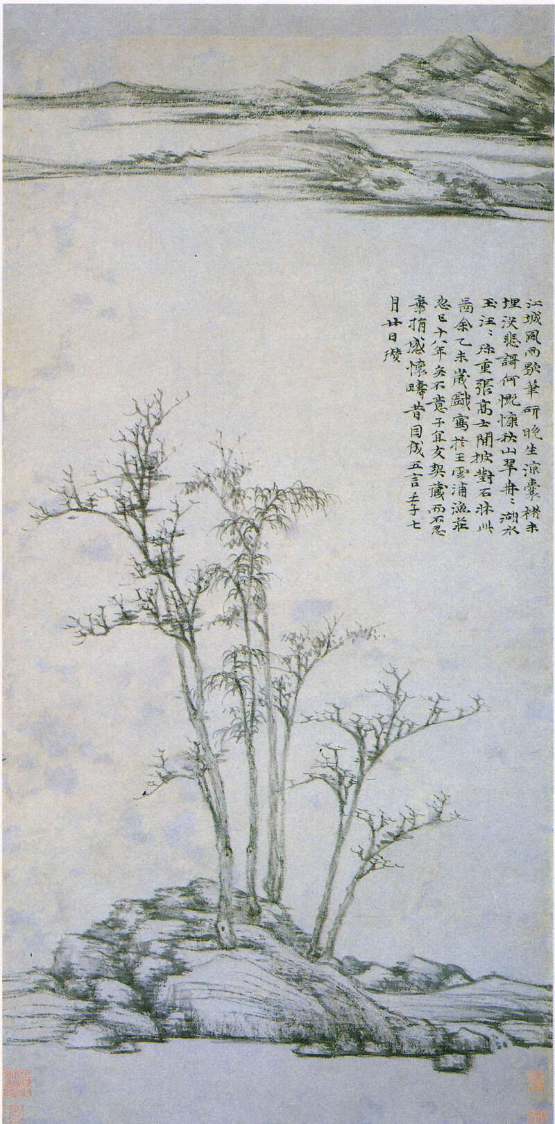 将留白艺术发挥到极致的当属倪瓒。倪瓒的留白是为水域和天空准备的,他用寥寥数笔勾勒出山的轮廓,然后留下一片干干净净的白色,几乎不事墨色——将观者带进倪瓒的美学空间的,不是山,恰是水天处的空白。在倪瓒笔下,山只是陪衬,水和天才是主体,虚实和主次的关系在倪瓒的空间维度里发生了巨大反转。所以《渔庄秋霁图》也好,《秋亭嘉树图》也罢,倪瓒笔下的山水总透着点点寒意,大片的留白给即将南下的冷空气腾出了呼啸而过的空间——凉意在呼吸间浸透肺腑,最终化作无限的寂寞。