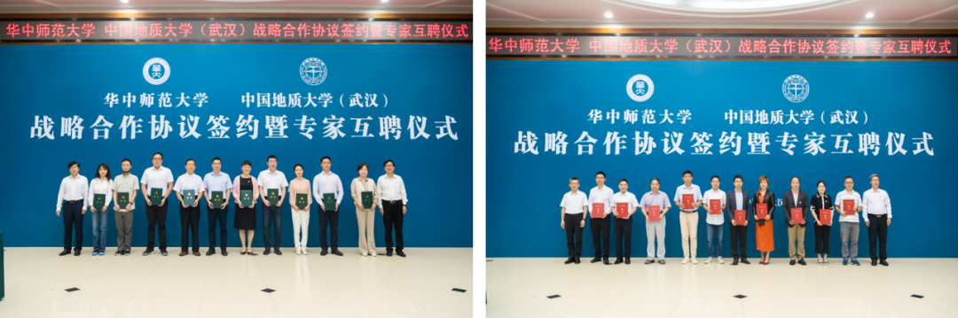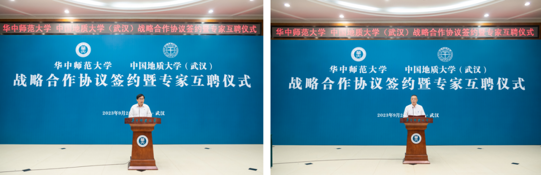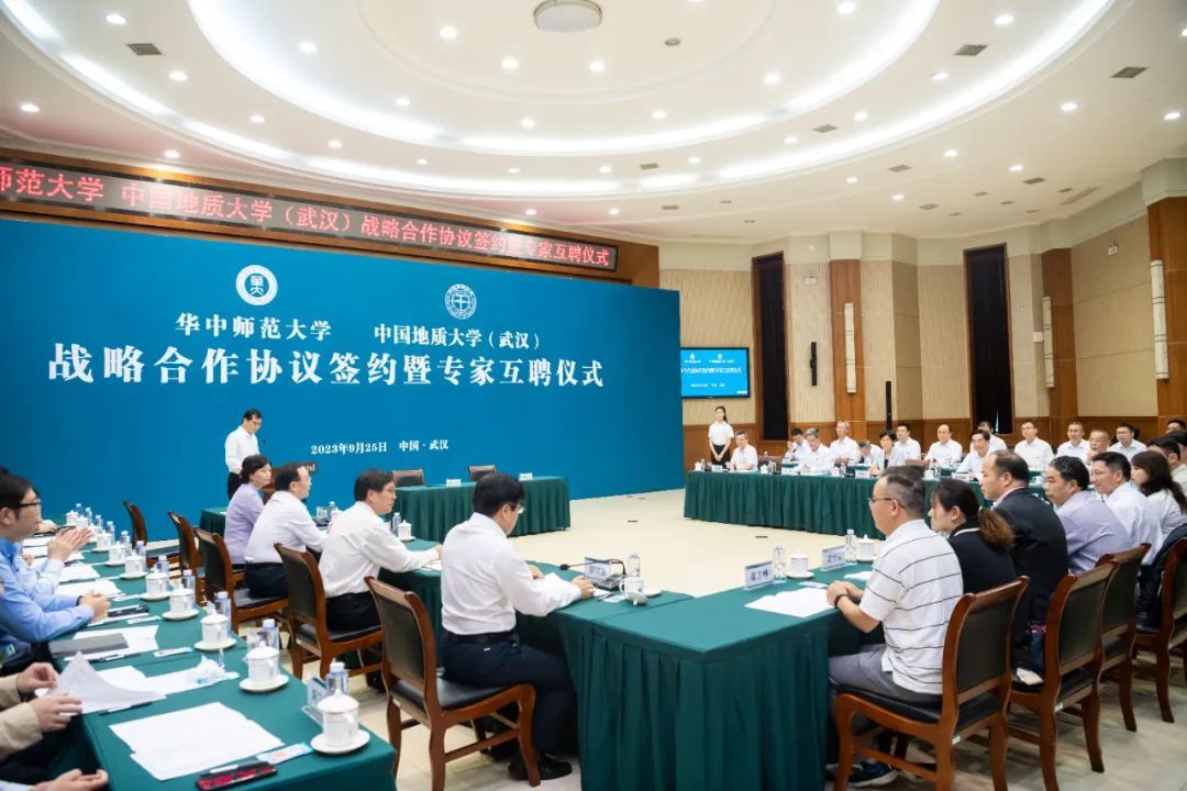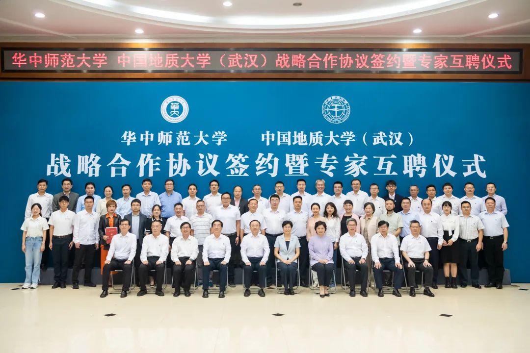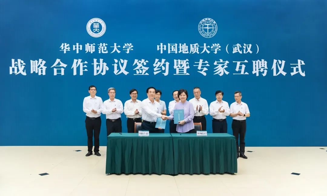 华中师范大学校长郝芳华与中国地质大学(武汉)校长王焰新代表双方学校签署战略合作协议