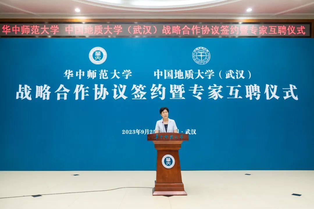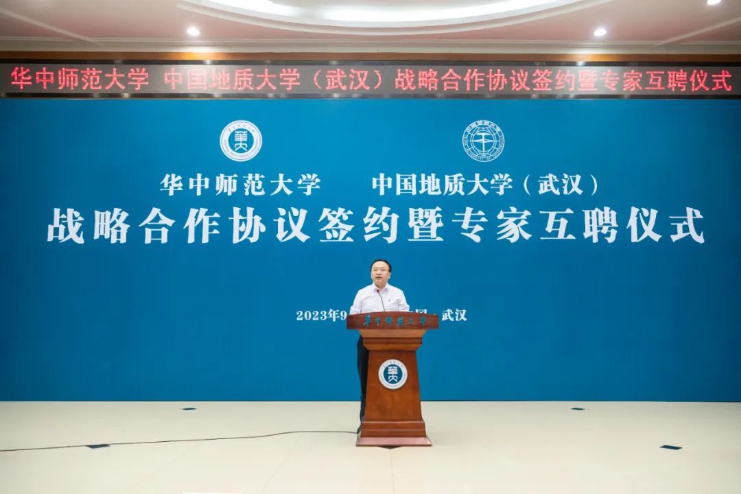 夏立新在讲话中表示,两校签订战略合作协议,充分发挥各自学科特色优势,在新工科、新文科建设上相互支持、携手共进,既是学校办学史上的一件大事,也是湖北高等教育事业高质量发展的一个重要里程碑。“艰苦朴素、求真务实”是地质大学校训,“朴实”二字也刻入华师精神,写进华师血脉。严谨求实的科学精神,广博高雅的人文精神,自强不息的奋斗精神,立德树人的育才精神,构成了地大和华师共同的文化基因。精神气质相近、学科特色互补为两校携手发展奠定了良好基础。希望两校在今后的合作中扎根中国大地,携手服务党和国家重大战略需求,聚焦重点领域,强化优势互补,优化合作机制,拓展合作范围,实现双向赋能,为世界一流大学建设闯新路、创示范,为构建高质量高等教育体系、推动实现中国式现代化作出更大贡献。