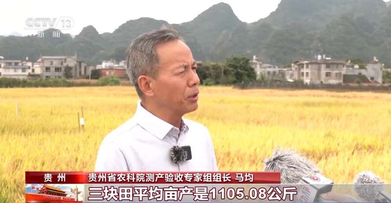 贵州省农科院测产验收专家组组长 马均:三块田平均亩产是1105.08公斤,最高的一块田亩产是1174.16公斤,这个产量在全国来说也是一个很高的水平。尤其对于同等生态区来说,是一个很高的产量水平。