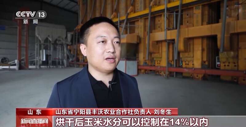 山东省宁阳县丰沃农业合作社负责人 刘冬生:我们有10台烘干设备,一天可以烘干玉米600吨。烘干后,玉米水分可以控制在14%以内。通过传输带运输,直接可以入仓储存。