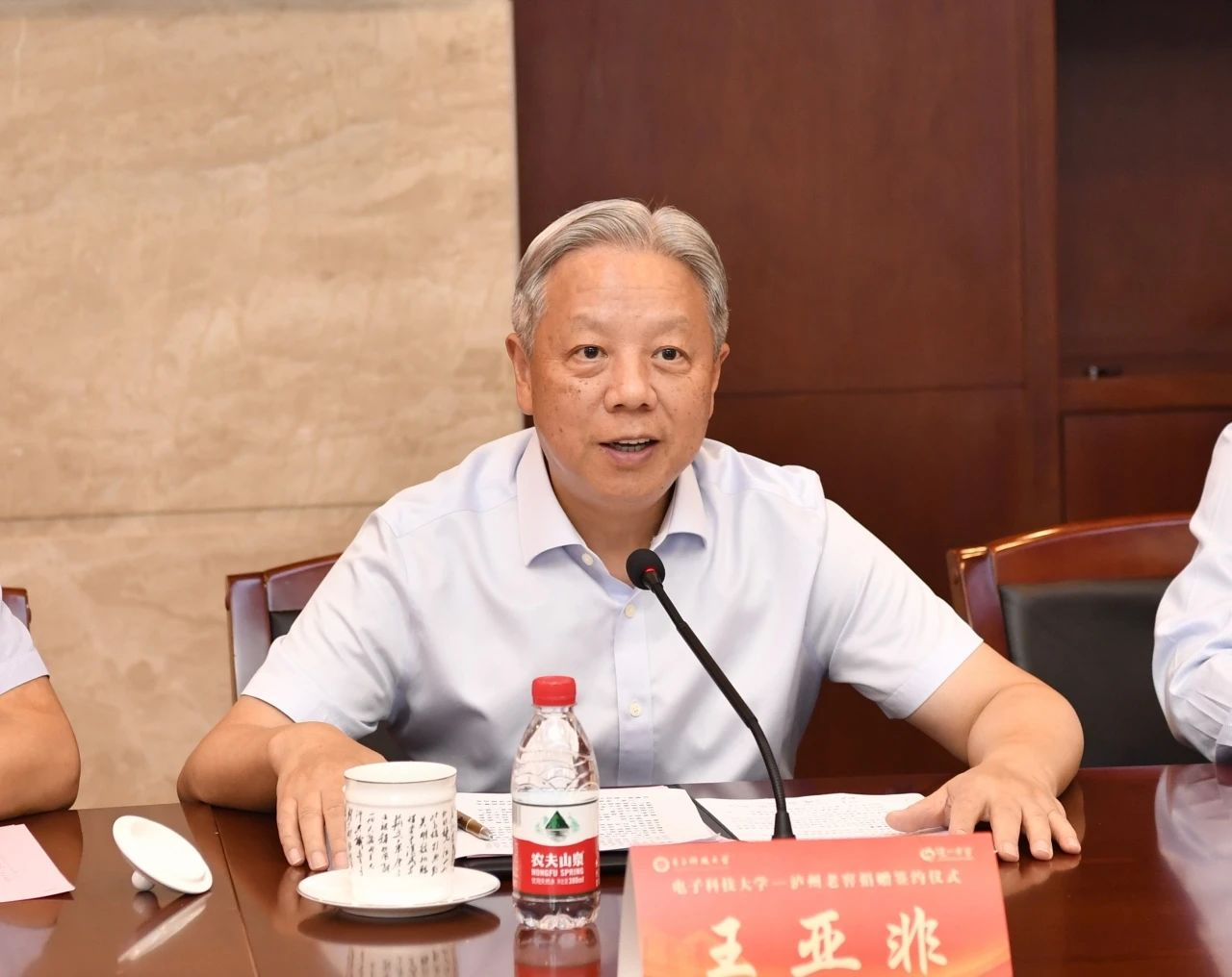 王亚非代表学校感谢泸州老窖对学校教育事业发展的大力支持。他表示,电子科大作为我国电子信息领域高新技术源头和创新人才基地,为民族电子信息产业的创新发展作出了重要贡献。泸州老窖助力公益慈善事业、心系教育,得到了社会各界的广泛赞誉和认可。学校与泸州老窖有着深厚的友谊和良好的合作基础,希望双方以此次捐赠为新的起点,建立更加紧密的战略合作伙伴关系,充分发挥双方人才、技术、资金和管理等方面的优势,建立长效合作机制,结成强强联合、共谋发展的命运共同体、发展共同体。