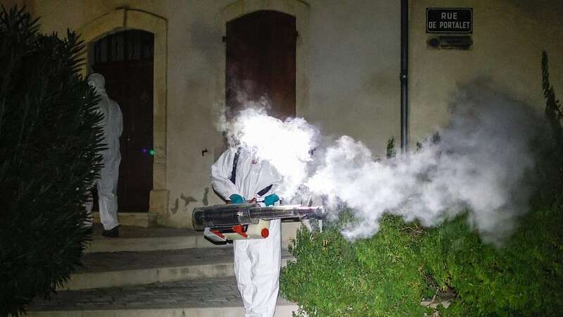 当地时间2023年9月30日凌晨3点至5点,法国布尔邦,工作人员开展蚊虫控制行动,该地区在虎蚊叮咬后出现了两例登革热病例。 视觉中国 图