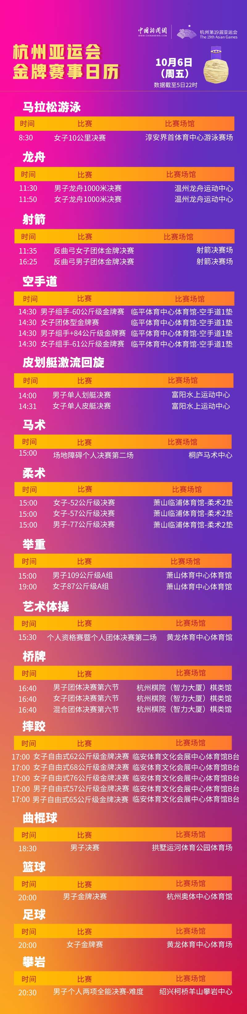 中新网10月6日电 6日,杭州亚运会迎来倒数第3个比赛日,将产生30枚金牌。中国选手在举重、皮划艇、龙舟、桥牌等项目上具备冲金实力。首次进入亚运会的霹雳舞项目也在今日开赛。