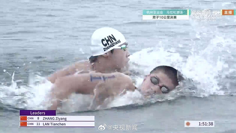 10月7日,杭州第19届亚运会马拉松游泳男子10公里比赛,中国选手张子扬夺得金牌,兰天辰获得银牌。