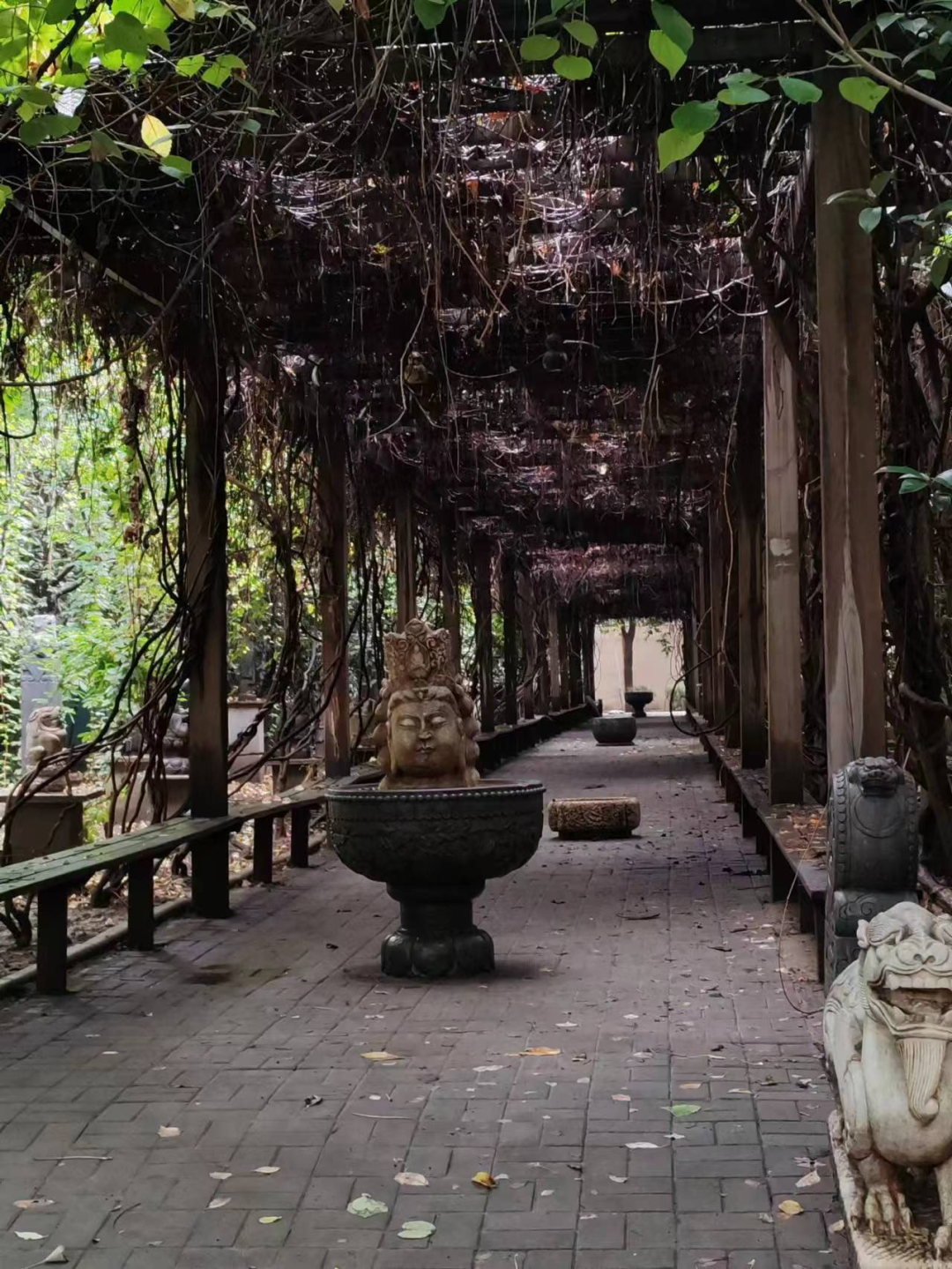 这个凉亭放了很多自由艺术家的雕塑作品,或是佛像或是生动的泥人,也有精致的后现代作品,一切都跟记忆中的样子无异。但是时过境迁,十月的长廊不再有花开,雨后的泥土散发出清香,禹申的高中记忆就封存在这里。
