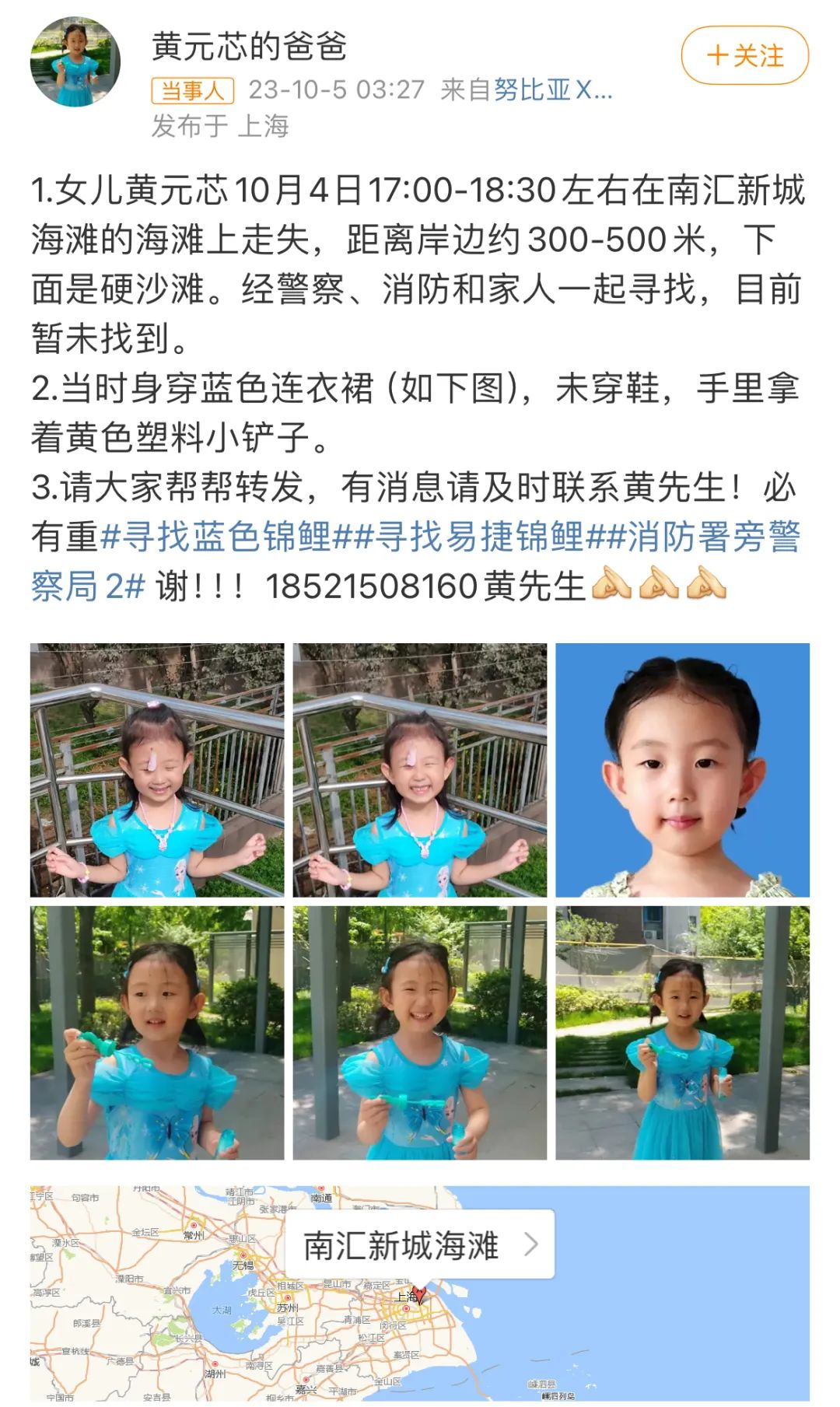 10月6日深夜,@黄元芯爸爸 公布了多张带时间点标注的照片,称都是走失女童黄元芯的照片,来源于网友提供的线索。