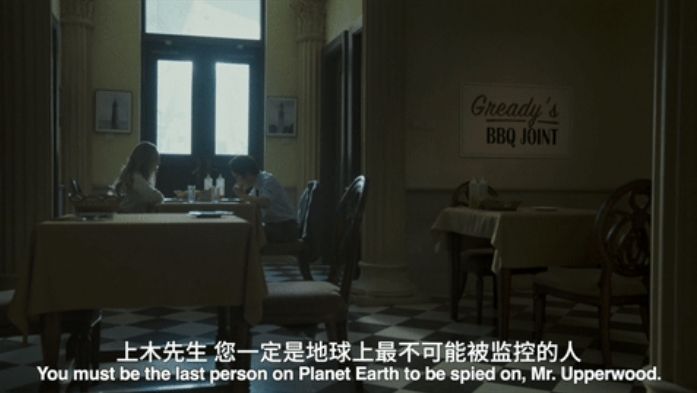 微电影一开始,美政客“上木”和女助理“那厮媞”来到了“哥来盯”烤肉店。“那厮媞”拍起美食根本停不下来,还把摄像头对向正在吃烤猪排的“上木”,以至于他露出不耐烦的表情,示意她为了两人的聊天安全赶快停止拍摄。一场有关监控的讨论也由此展开。