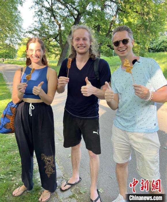 托比(右一)拍摄炸串视频时与路人合影。受访者供图