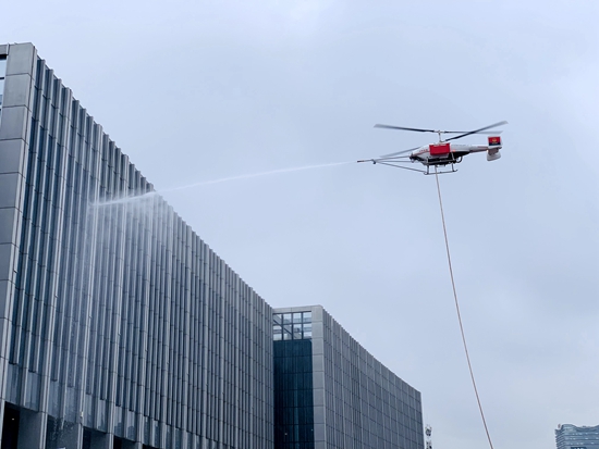 一款款消防涂装无人直升机原地升至6层楼高度,随着地面指挥人员一键令下,机腹上挂载的水带喷射水柱如泉涌,在空中划出“长虹”,精准扑灭高层火势。