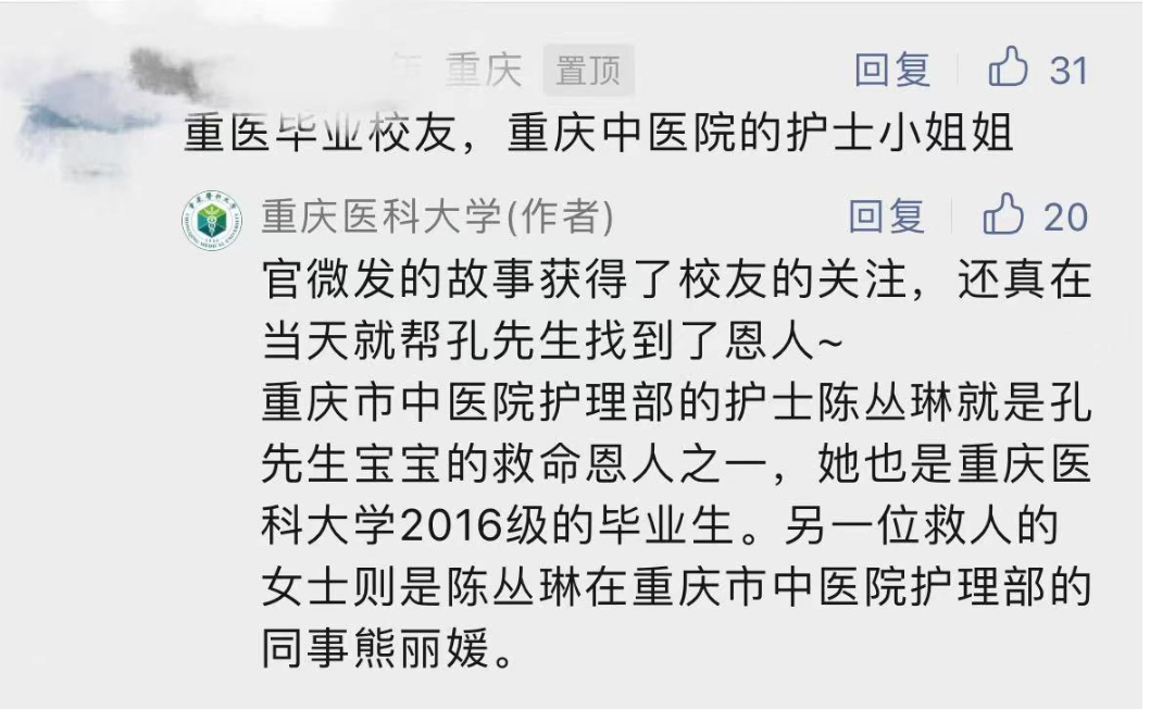 重庆市中医院护理部的护士陈丛琳就是孔先生宝宝的救命恩人之一,她也是重庆医科大学2016级的毕业生。
