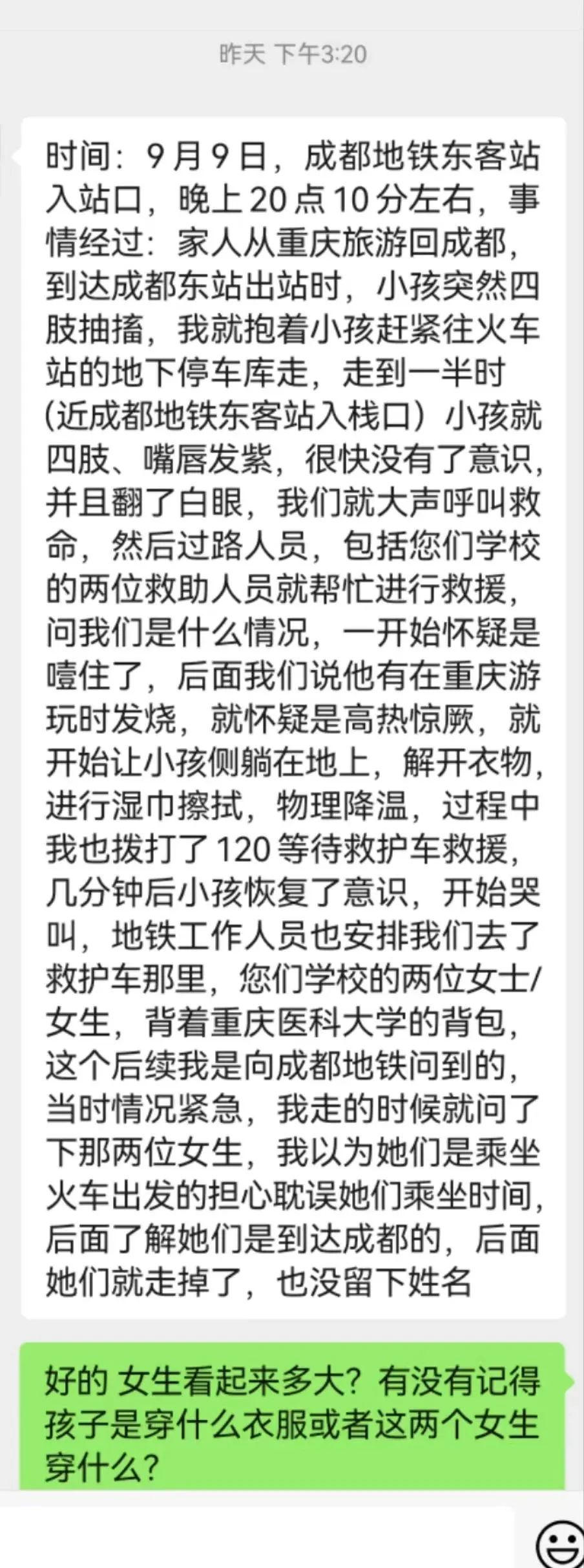 慌乱之中,孔先生一家没来得及留下帮助孩子的好心人的联系方式,后续他返回询问地铁工作人员,地铁方表示,记得两人背着印有“重庆医科大学”字样的背包,那时两人已经悄然离去,没有留下任何信息。