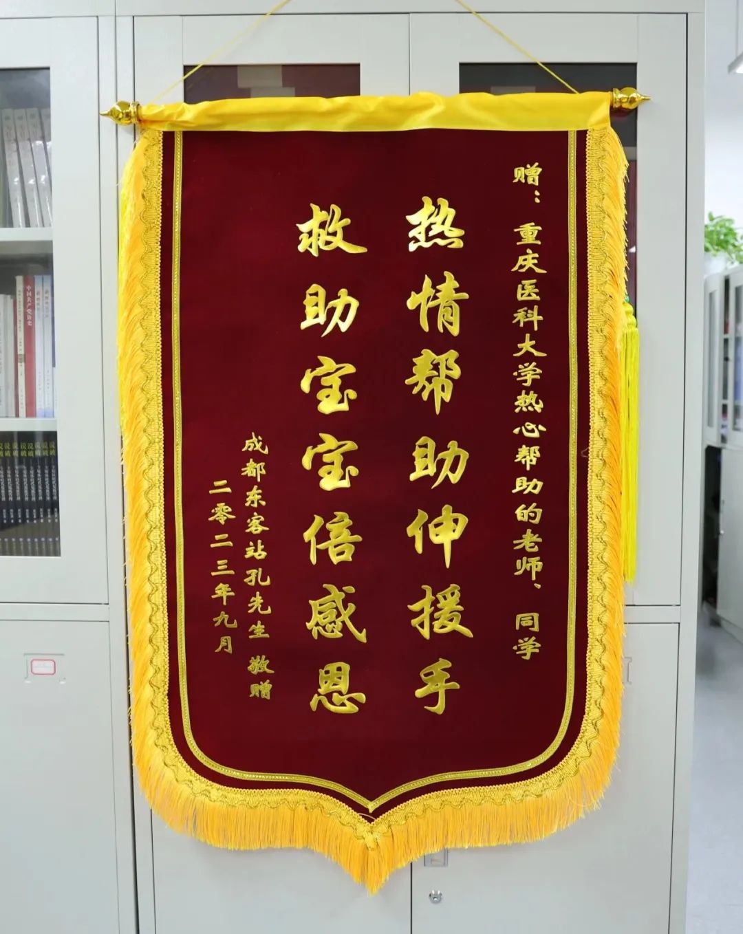 学校收到从成都寄来的一面锦旗