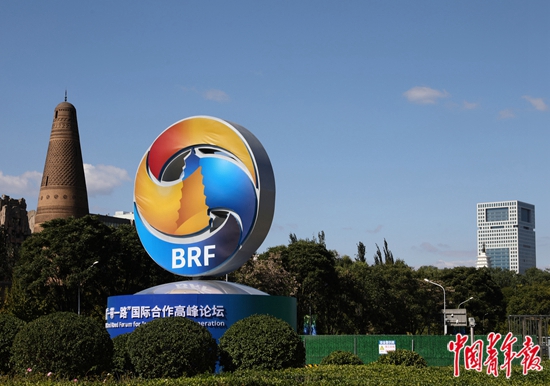 10月9日,位于北京中轴线北延长线的奥林匹克景观大道南端,第三届“一带一路”国际合作高峰论坛的雕塑。第三届“一带一路”国际合作高峰论坛举行在即,北京街头的相关雕塑、道旗、宣传标语等陆续布置,迎接论坛的氛围渐浓。中青报·中青网记者 陈剑/摄