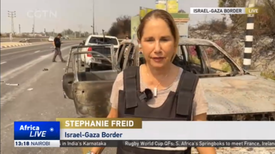 总台报道员斯蒂芬妮·弗里德,在以色列南部边境地区探访遭袭地区,通过新媒体直播介绍以色列政府采取的反制措施。