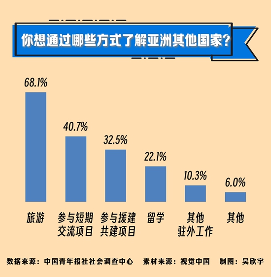 你会通过什么方式了解亚洲?68.1%的受访者选择了旅游,40.7%的受访者选择参与短期交流项目,32.5%的受访者选择参与援建共建项目,其他还有留学(22.1%)、驻外工作(10.3%)。