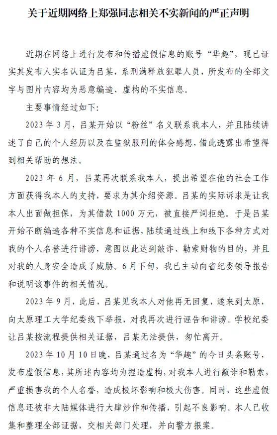 10月12日,郑强在其个人微信公号发布声明称,近期在网络上进行发布和传播虚假信息的账号“华趣”,现已证实其发布人实名认证为吕某,系刑满释放犯罪人员,所发布的全部文字与图片内容均为恶意编造、虚构的不实信息。