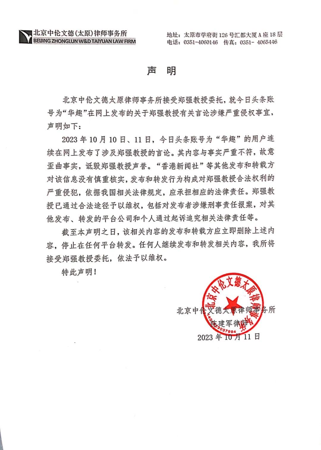同时,北京中伦文德太原律师事务所接受郑强教授委托发表声明,称将依法予以维权。