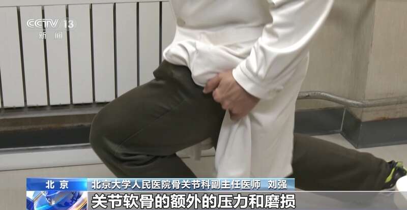 北京大学人民医院骨关节科副主任医师 刘强:膝关节需要屈伸负重,像上下楼、蹲这些活动的时候,膝关节这种内扣就会造成关节软骨的额外的压力和磨损,通过正确的发力方式来这样屈伸,让它减少内扣,减少膝盖前冲,这样就能减少关节的磨损。